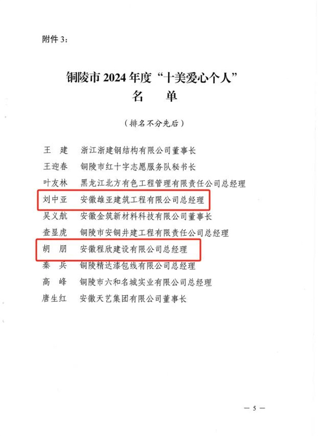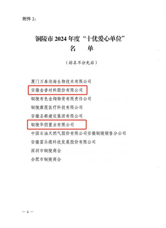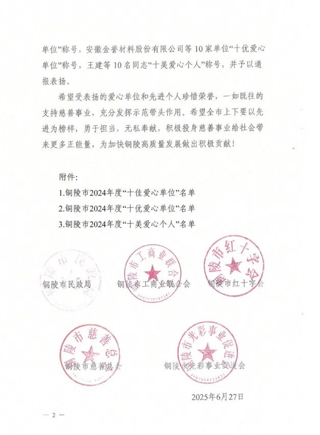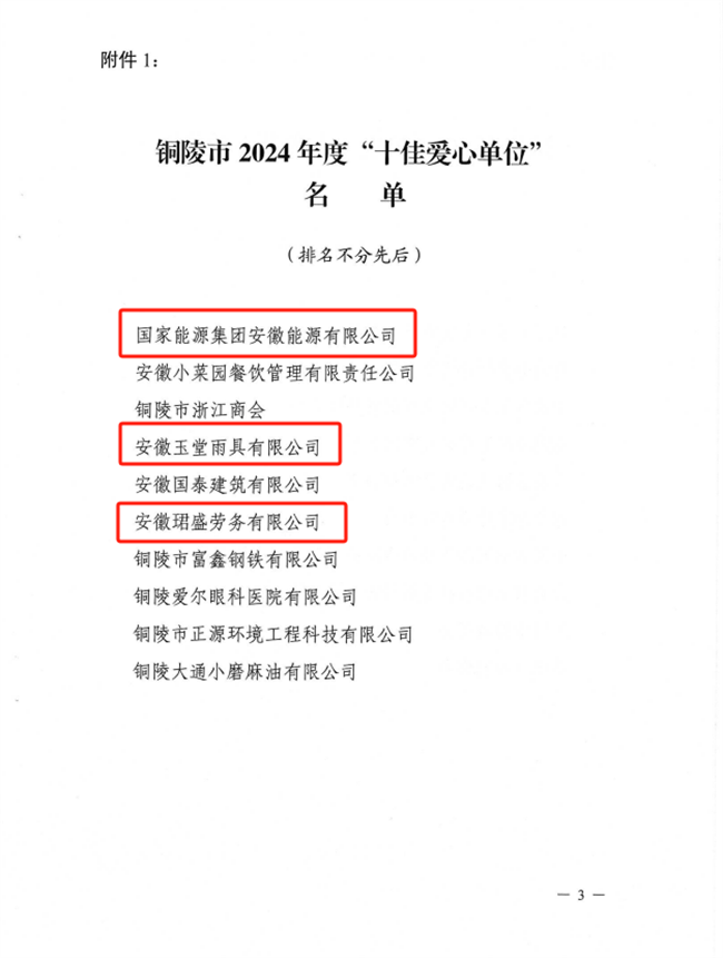 近日,铜陵市民政局、市工商联、市红十字会、市慈善总会、市光彩会联合下发了《关于表扬铜陵市2024年度“十佳”“十优”“十美”爱心单位和个人的通报》。其中,县红十字会推报的国家能源集团安徽能源有限公司、安徽玉堂雨具有限公司、安徽珺盛劳务有限公司被评为“十佳爱心单位”;安徽金誉材料股份有限公司和铜陵华朋置业有限公司被评为“十优爱心单位”;刘中亚、胡朋被评为“十美爱心个人”。