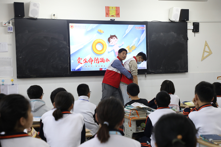 5月11日,在枞阳二中东校区,枞阳县红十字会志愿者向学生们传授防溺水知识及自救基本技能。志愿者结合理论知识和实际救护技巧,讲解突发状况急救、心肺复苏、救生设备穿戴等项目的实景示范教学和模拟演练,提高学生们防溺水应急避险与安全救护能力。