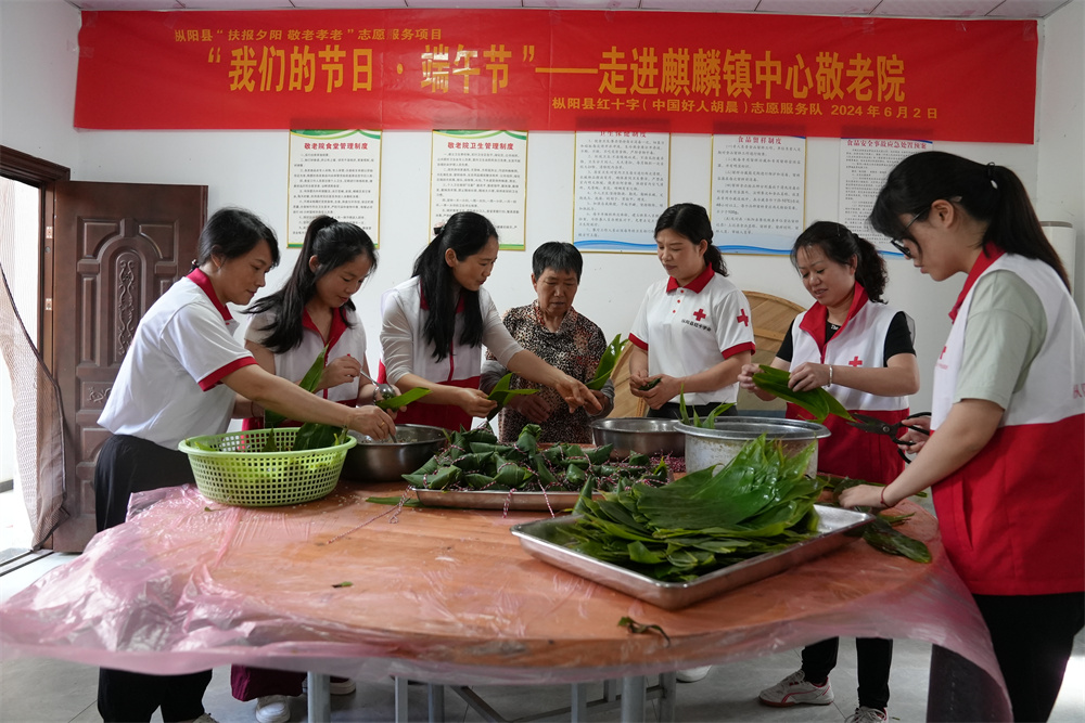 在端午佳节来临之际,枞阳县红十字会组织志愿者前往麒麟镇敬老院,开展了“我们的节日——端午节”主题活动。此次活动旨在传承和弘扬中华民族的传统美德,同时为敬老院的老人们带去节日的温暖与关怀。