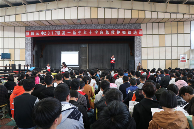 11月10日下午,枞阳县红十字会在枞阳三中开展2017级高一新生红十字应急救护知识培训,参训师生约500余人,发放应急救护知识手册500余份,应急救护包50余份,受到培训师生的热烈欢迎。