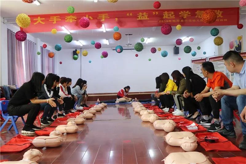2019年5月6日至7日,枞阳县红十字会中国好人(胡晨)志愿服务队开展了安徽省红十字2019“益行计划”志愿服务项目,以“大手牵小手,“益”起学急救”为主题,为县示范幼儿园的40余名教师及保育员进行了为期两天的救护员培训,全方位讲解《中华人民共和国红十字会法》、红十字运动基本知识、心肺复苏、气管异物梗阻、溺水等常见生活意外的预防、处置及现场演练。让幼儿园老师及保育员掌握红十字相关救护知识及技能,为每一位幼儿园小朋友添一件“安全外套”。