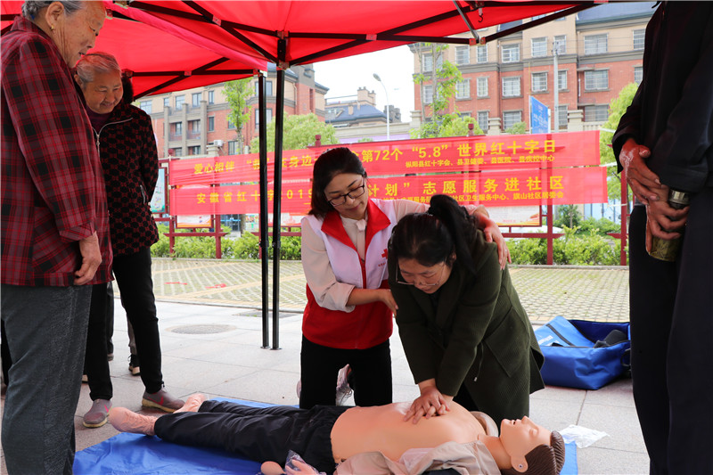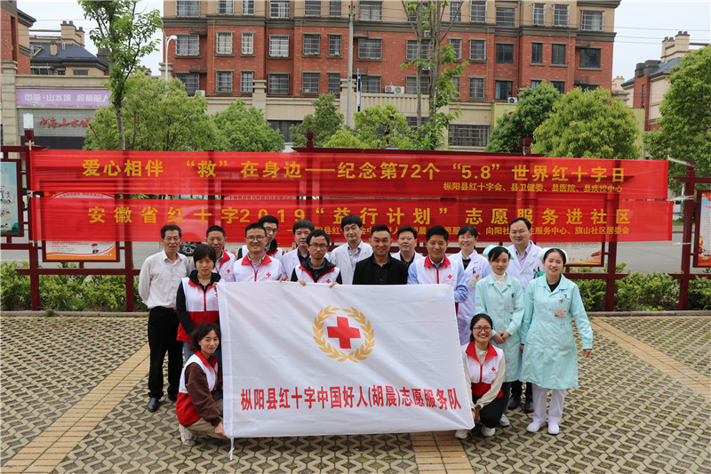 2019年5月8日上午,枞阳县红十字会联合县卫健委、县医院、县疾控中心、向阳社区卫生服务中心、旗山社区居委会等多家单位在旗山社区居委会门口举行以“爱心相伴,‘救’在身边”为主题的纪念第72个“5.8”世界红十字日宣传义诊活动。活动以宣传普及《中华人民共和国红十字会法》和红十字运动基本知识、“三献知识”和开展应急救护培训、无偿献血、健康义诊、健康咨询为主。